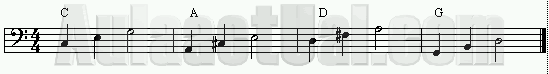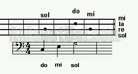 | El primer acorde que estudiaremos será el acorde mayor, y lo tocaremos en DO, las notas deben sonar de más graves a más agudas: | ![]() |